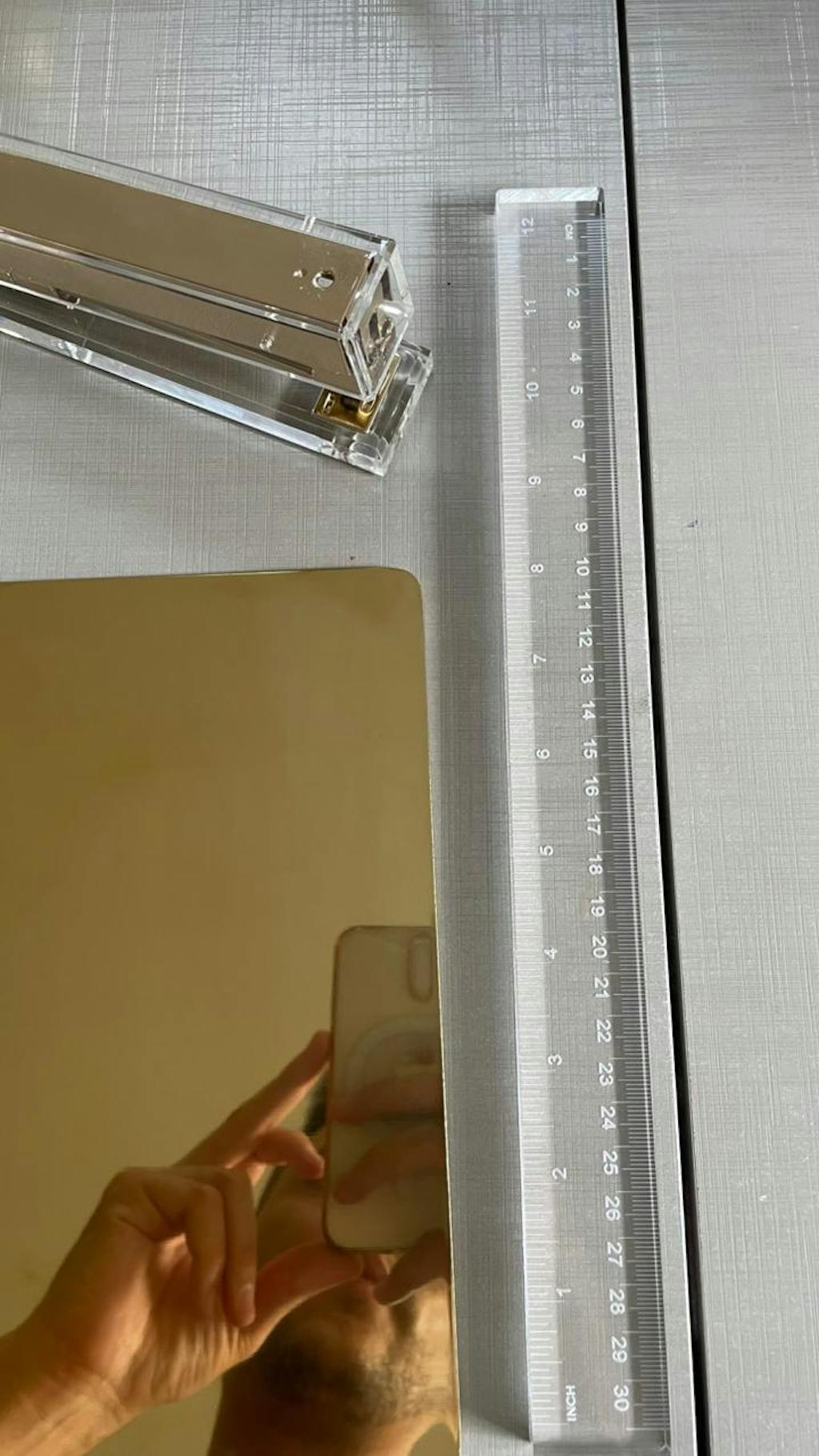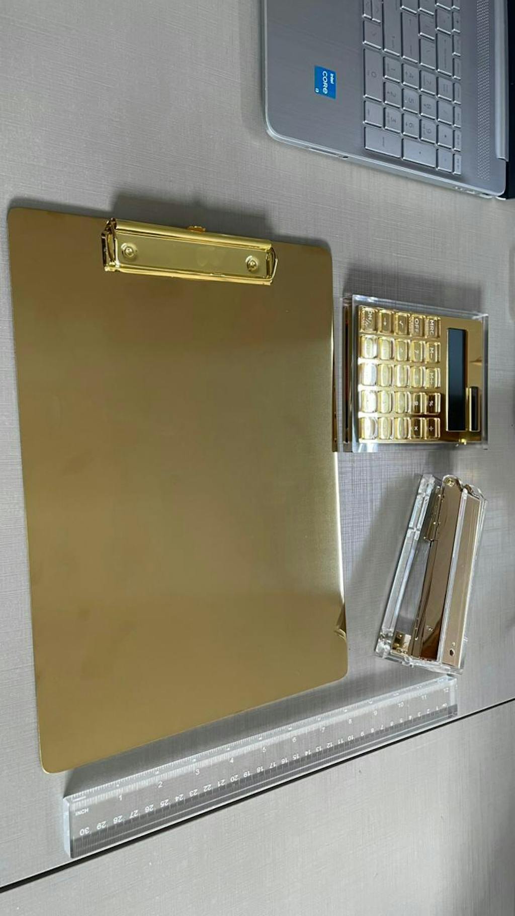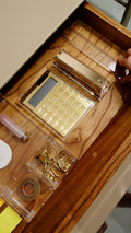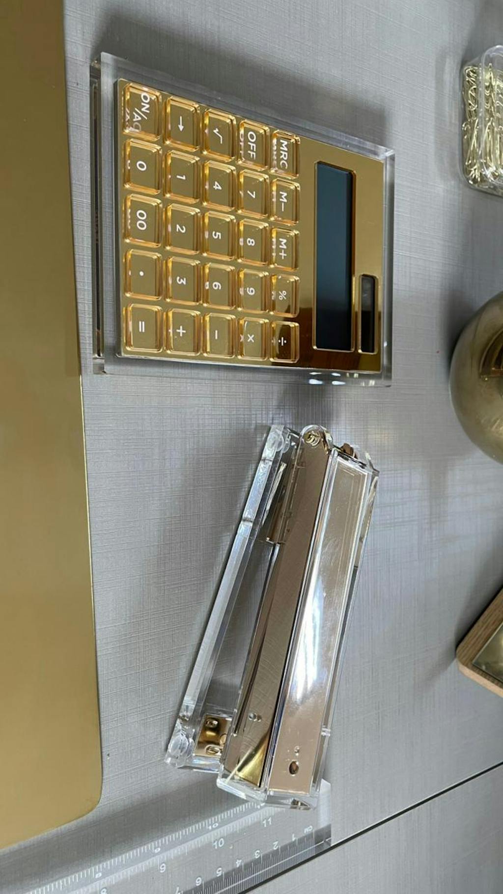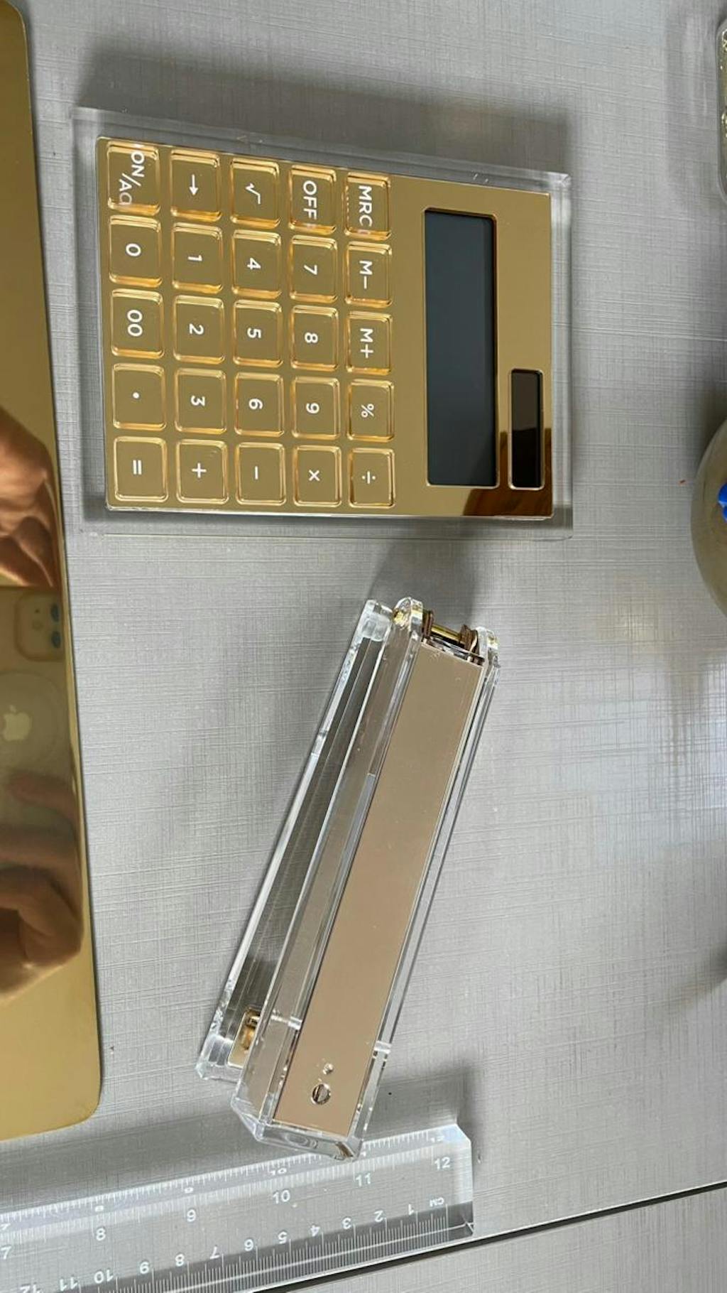 Transforme seu ambiente de trabalho com a Calculadora Clear Gold, que une design sofisticado e funcionalidade em um único objeto. Produzida em acrílico espelhado dourado com moldura em acrílico transparente, ela vai além de uma simples calculadora: é um item de estilo e decoração para a sua mesa.