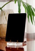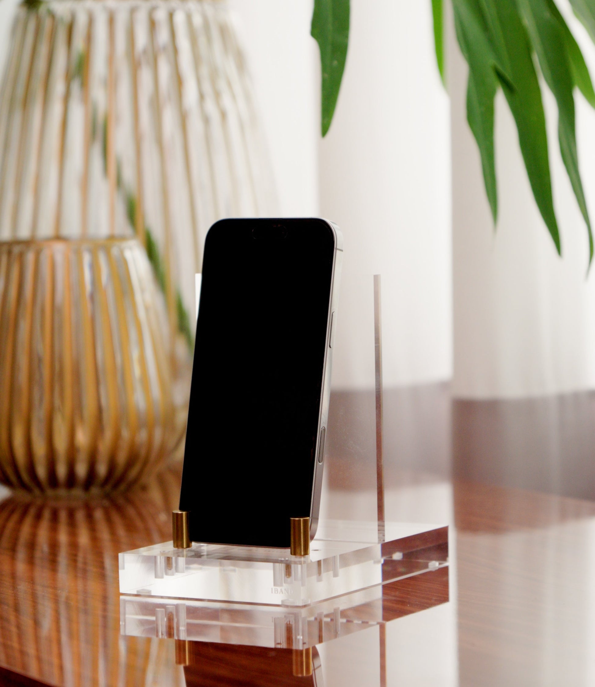 Produzido em acrílico cristal com bordas polidas e ferragens douradas ajustáveis, o Suporte Clear Gold combina sofisticação e funcionalidade para apoiar celular, tablet, além de exibir fotos, livros, cartões, obras de arte ou até pequenas peças decorativas.